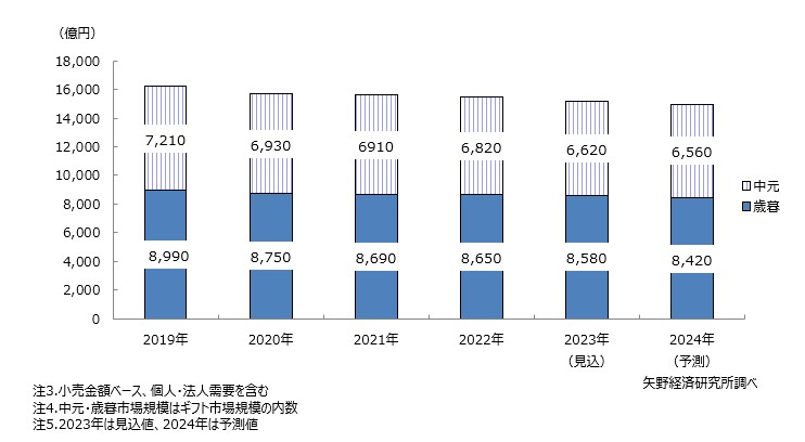 矢野経済研究所の調査によると、お中元やお歳暮といったフォーマルギフト市場は縮小が続いています。その背景には、ライフスタイルや人間関係の変化があると考えられます。