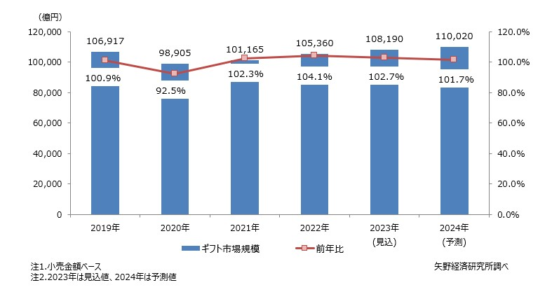 矢野経済研究所の調査によると、2022年のギフト市場規模は約10兆5,360億円、2023年には約10兆8,190億円となり、前年比で2.7%増加しています。