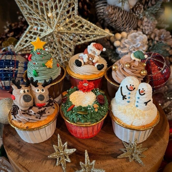 シフォンケーキ、ガトーショコラ、チーズケーキの3種のカップケーキ生地に楽しいクリスマスを表現しました。