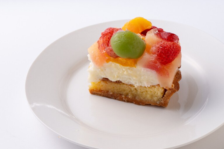 総重量は400gというたっぷりのいちご、みかん、若桃、マンゴー、洋梨がのった、鬼盛りという名にふさわしい、カラフルなタルトです。シャキシャキの洋梨や、フレッシュな味わいそのままのいちごなど、ジューシーで甘酸っぱいフルーツに取り合わせたのは、ジャージー乳の濃厚なカスタード。サクサクに焼き上げたタルトと合わせると、三層が見事にマッチ。
