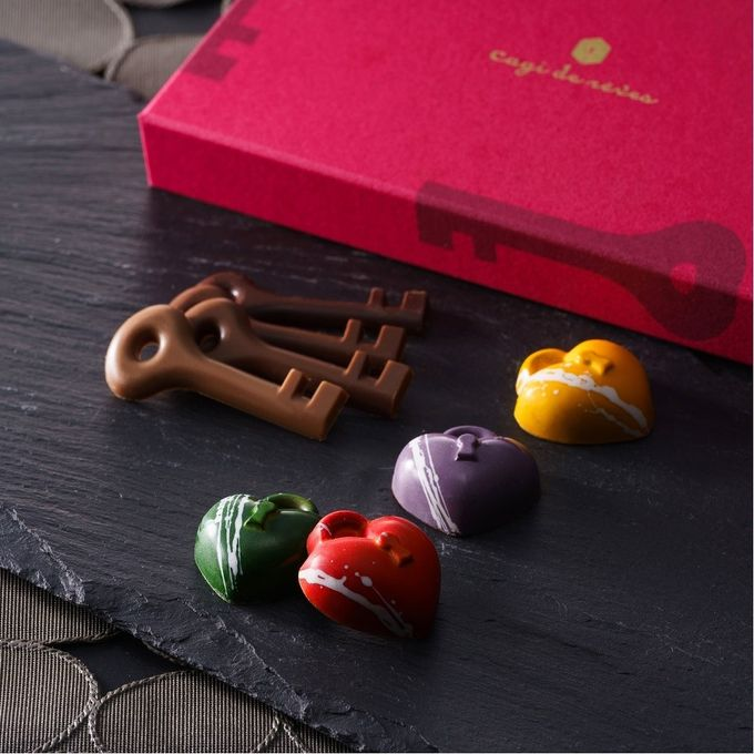 パリ・セーヌ川に架かる橋「ポンデザール」で、恋人同士が永遠の愛を誓い、二人の名前を書いた南京錠(カディナ)を金網に取り付けて鍵をかけ、その鍵を川に投げ込む「カディナ ダムール」をモチーフにした鍵・南京錠型のショコラアソート。味はカカオ分33~64%の4種の鍵型ショコラと新作のフリュイルージュを含むオレンジ、ライム、パッションの4種の南京錠型ショコラをラインナップ。カカオ本来の風味ととろ~りとろけるキャラメルショコラをお楽しみください。