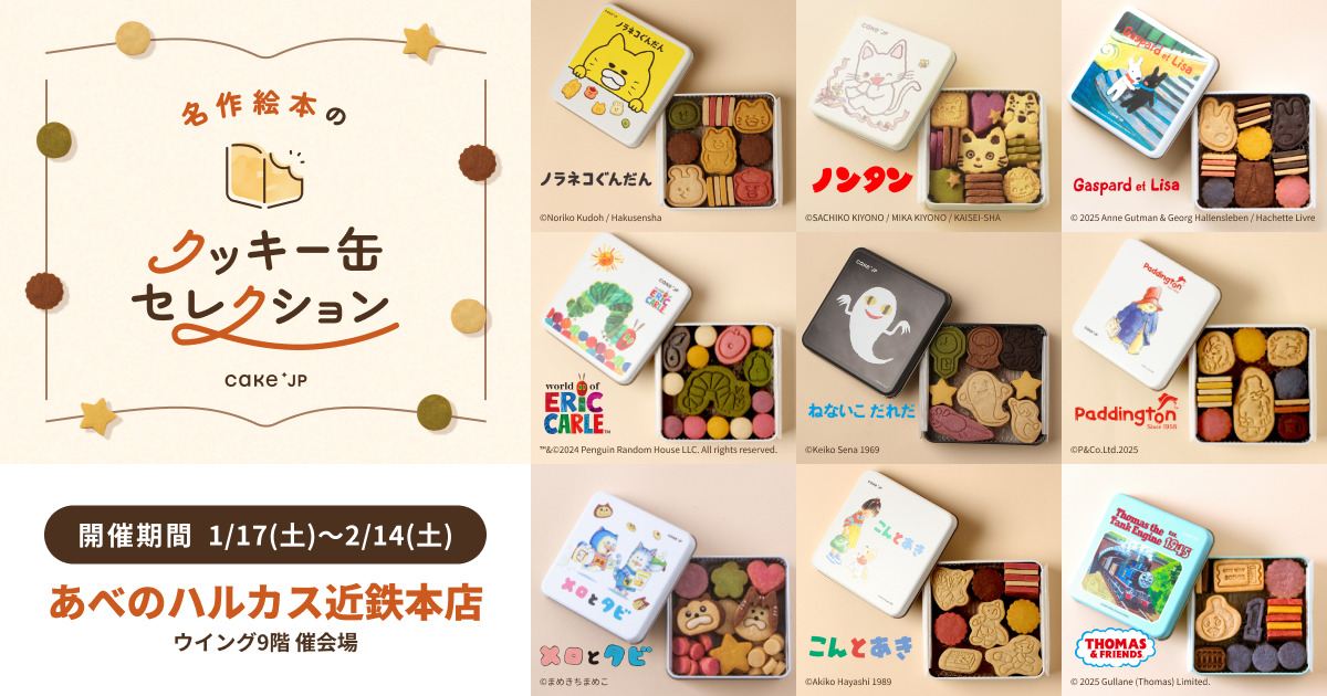 ケーキ・スイーツ専門通販サイト「Cake.jp(ケーキジェーピー)」を運営する株式会社Cake.jp(本社:東京都新宿区、代表取締役:高橋 優貴)は、1月17日(土)から2月14日(土)の29日間、大阪・あべのハルカス近鉄本店 ウイング9階 「バレンタインショコラコレクション 2026」会場にてCake.jpと大人気の絵本がコラボしたオリジナルクッキー缶をご購入いただけるポップアップストア「名作絵本のクッキー缶セレクション by Cake.jp」を期間限定で出店します。