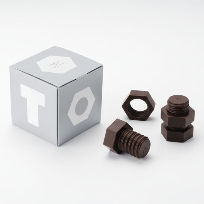 『明治日本の産業革命遺産』が世界遺産に登録されました。 この遺産群の中には、北九州市の『官営八幡製鉄所関連施設』が含まれています。 “世界遺産のある街・北九州”のお土産として製鉄所の鉄をイメージした、ボルトとナットの形のチョコレートが生まれました。 チョコレート型は3Dプリンタで作成し、ネジチョコは作られています。 カカオ50%のスイートチョコを使用して作られたボルトとナットのチョコレートは、実際に締めて遊ぶことが出来ます。