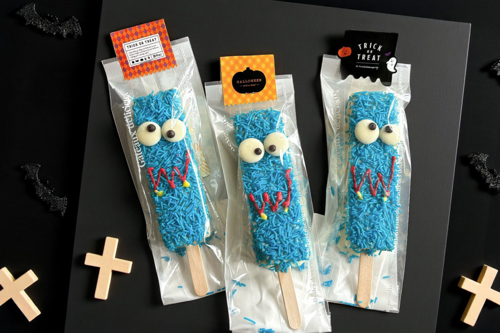 - 鮮やかなブルースプレーと、ザクザク食感のチョコスプレーが楽しい一本。「うわ〜!食べられちゃう〜!」と声が聞こえてきそうな、愛嬌たっぷりのモンスターです。