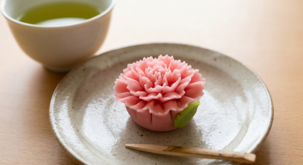 母の日の時期には、熟練の和菓子職人が一つひとつ手仕事で仕上げる、カーネーションを象った期間限定の上生菓子が多くの名店から登場します。花びらの繊細なフリルや、ほんのりと色づく美しいグラデーションは、まさに職人技の結晶です。