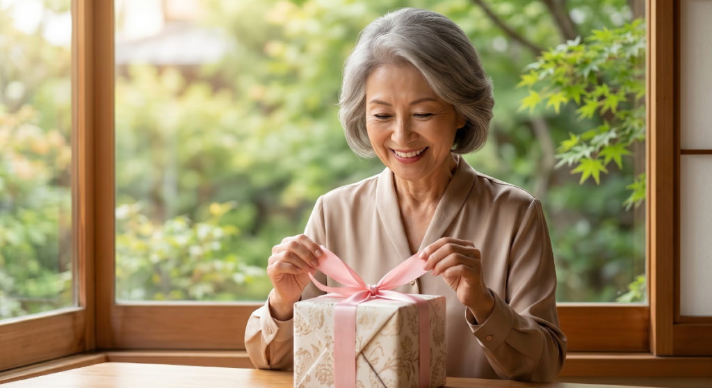 宛名などもあえて大きく書き込まず、「いつもありがとう。これからも自分の時間を大切にしてね」と、一言だけ温かい言葉を添える。さりげない気遣いが、和菓子のパッケージと調和してお母さんの心を掴む素敵なサプライズになります。