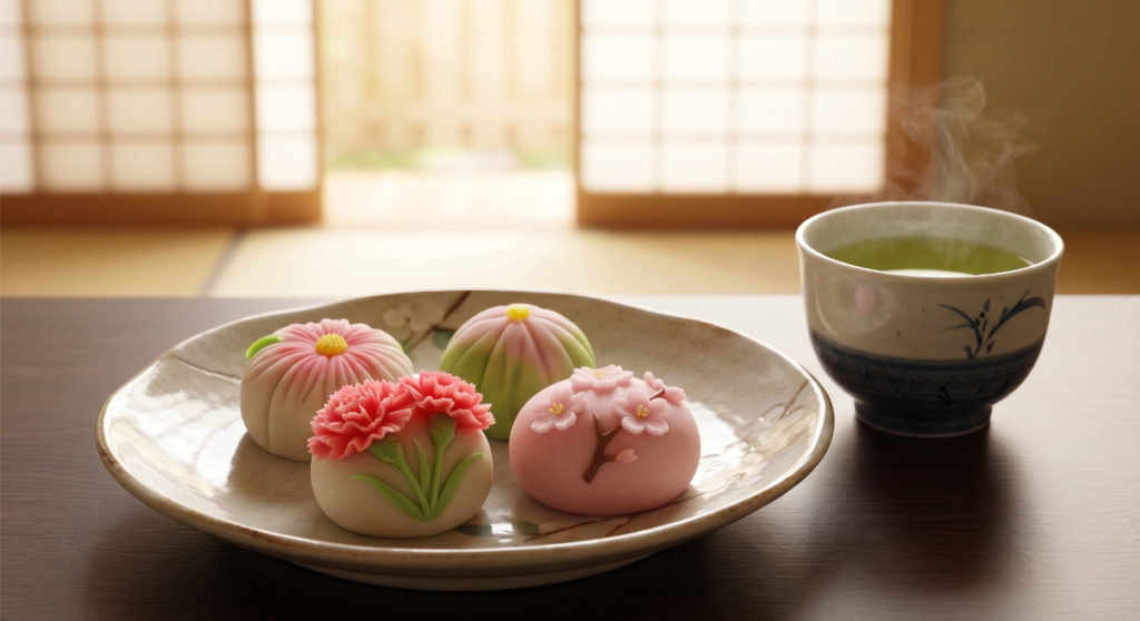 - 上生菓子:職人が花鳥風月を写し取った芸術性のあるお菓子です。白あんや練り切りを使ってカーネーションやバラの形に仕立てられた上生菓子は、食べるのがもったいなく感じるほどの美しさ。お抹茶や少し濃いめの緑茶と合わせて、じっくりと味わいたい一品です。