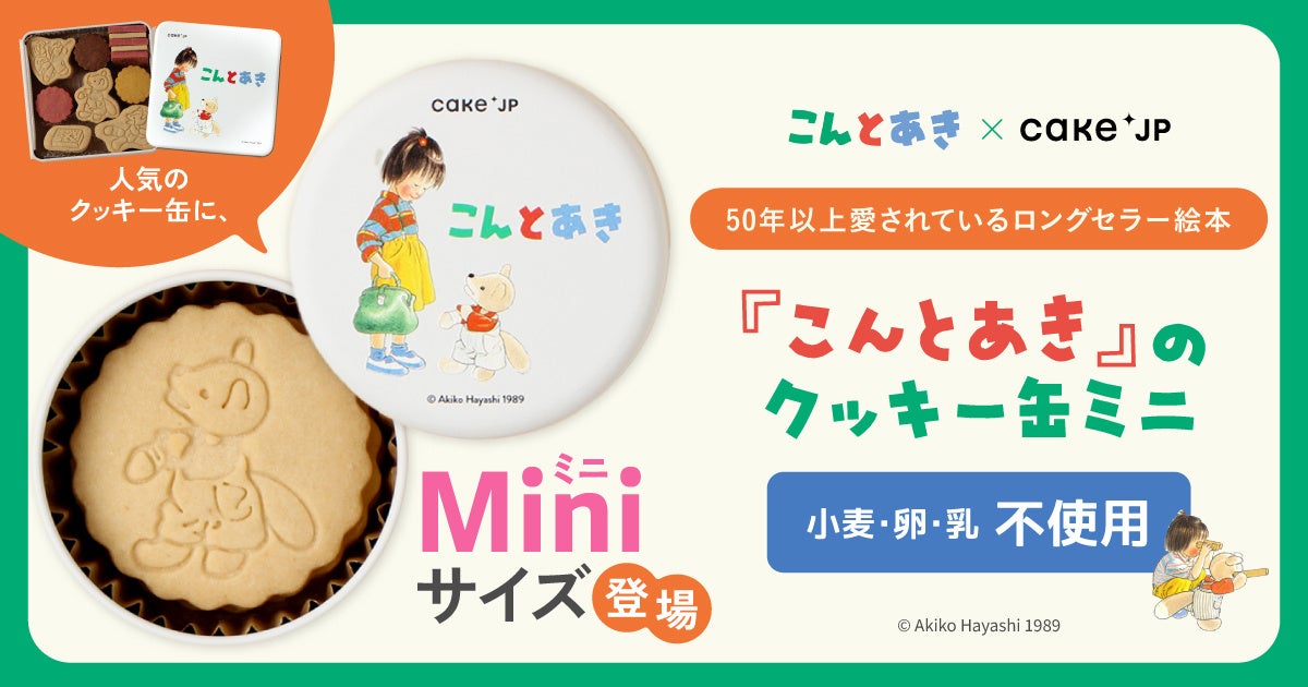ケーキ・スイーツ専門通販サイト「Cake.jp(ケーキジェーピー)」を運営する株式会社Cake.jp(本社:東京都新宿区、代表取締役:高橋 優貴)は、絵本『こんとあき』(作・絵/林明子、出版社/福音館書店〈1989年出版〉)とのコラボレーションクッキー缶のミニサイズを2025年4月22日(火)より販売いたします。