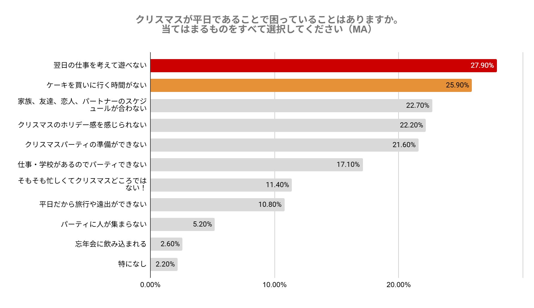 - クリスマスが平日であることの悩みは、「翌日の仕事のことを考えて遊べない」「ケーキを買いにいく時間がない」がTOP。「家族・友達・恋人・パートナーと予定が合わせられない」が続く結果に