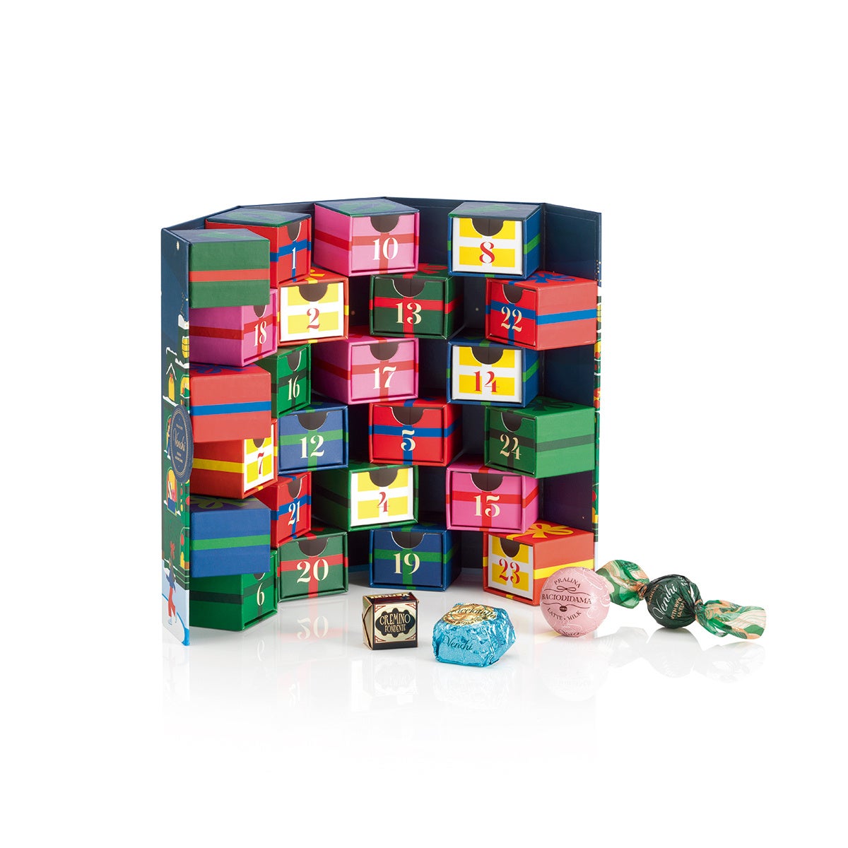 クリスマスを楽しむ人々を表紙に描いた、本の形をした人気のギフト缶のマキシサイズ。Venchiを代表するチョコビアやクレミノなど、チョコレート30個入。