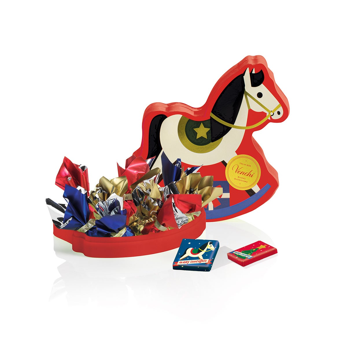 かわいらしい木馬の形をしたギフト缶に15個のチョコレートをアソート。木馬の形の缶は、部屋に飾れば一気にクリスマスムードに。