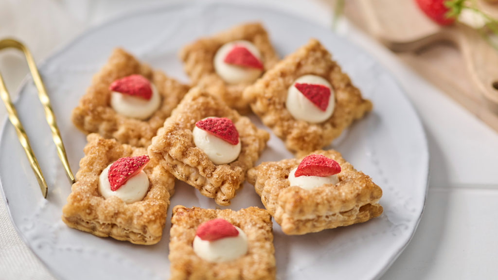 - 香ばしいパイの間には、なめらかなホワイトチョコクリームがサンドされています。 そして、オードリーの魂である「いちご」は、フリーズドライの粒としてクリームの中に。 ホワイトチョコのミルキーな甘さの中で、キュンとくる苺の酸味が鮮烈に香り立ち、バターたっぷりのパイ生地の後味を爽やかに引き締めます。