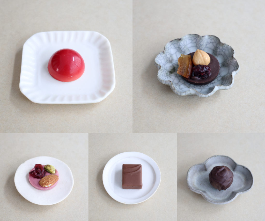 1. ボンボンショコラ(梅干しに見立てた主役) ラズベリーピューレを煮詰め、少量のミルクチョコを加えたガナッシュ。ラズベリーの豊潤な風味が楽しめます。