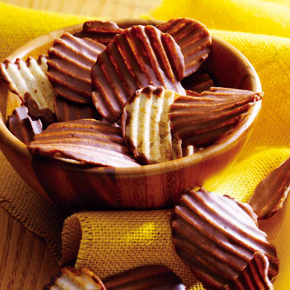 - 生のジャガイモを薄切りにしたポテトチップスの片面に、口溶けの良いチョコレートをコーティング。塩味と甘味のバランスが黄金比率で計算されています。