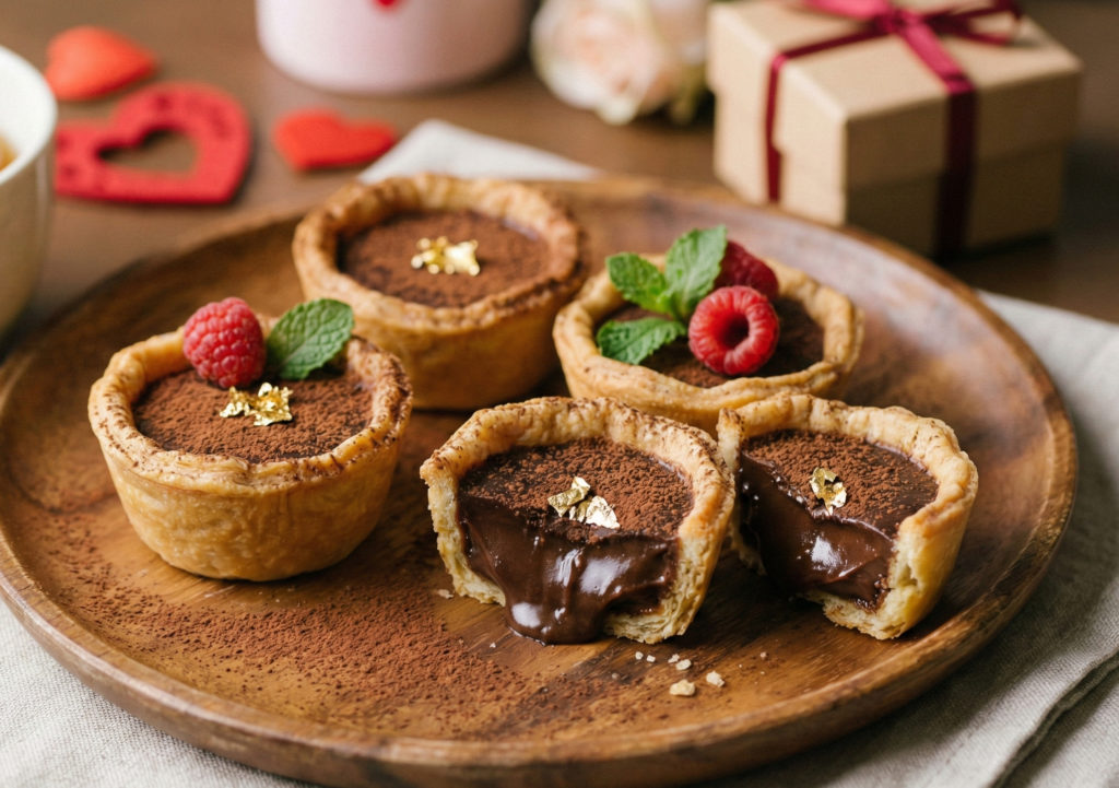 - 市販のタルトカップに、溶かしたチョコと生クリームを流し込んで冷やすだけ。アラザンやドライフルーツでトッピングすれば、プロのような仕上がりに。