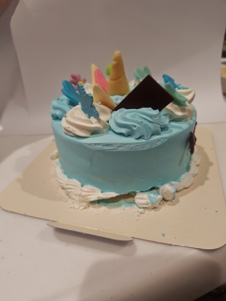 ぱっと見の見た目は、とても可愛らしいデザインでしたが、イメージ写真違い上に乗っている飾りの配置が逆だったり飾りの色や形が違っており、何か違うってなりました。また、配送されすぐに中身の確認をするとケーキの側面のクリームがえぐれていたり、崩れていました。クリームの崩れは配送時の崩れと言われてもそんな事もあるのかな⋯という感じですが、クリームのえぐれはえぐれた部分のクリームは何処にもなかったのでお店で紙の土台に乗せる時にはえぐれていたのではないかと思いました。可愛いデザインそのままが来ると思っていた為に残念でした。他にも素敵なデザインがあったのでお店の名前を出さずにデザインだけで子供に選んでもらった際に「これがいい!」と言った場合、同じ事が無いか心配になりました。味は食べていないので分かりません。