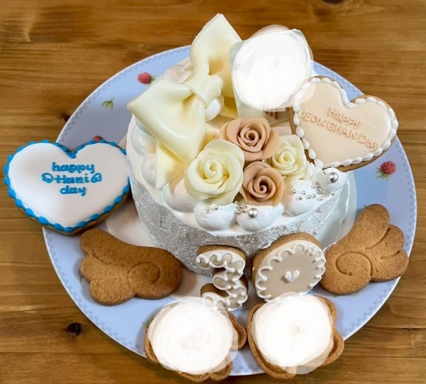 推しの誕生日に注文しました。昨年はピンク系だったので、今年はホワイト系のケーキを頼みました。