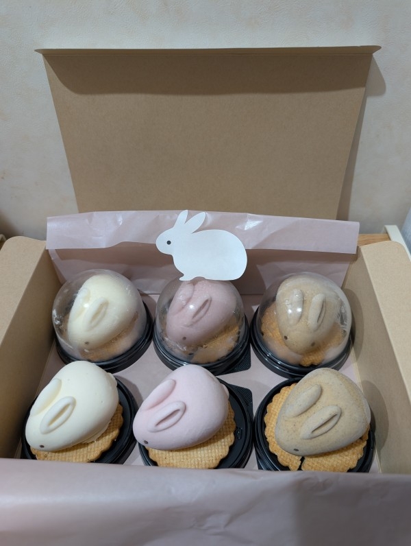 かわいいうさぎさんが届きました。中に入っているおもちがスプーンですくいにくいと感じましたが、甘さ控えめム―スにあんこが合っていて美味しかったです。土台のクッキーがほとんど割れていたのが残念でした。
