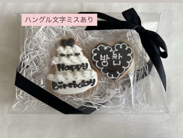 クッキーは可愛かったのですが、名前のハングル表記にミスがあるものが届きました。もともと推しの誕生日に間に合わせるつもりで購入しましたが、問い合わせたところ新品で対応していただいても発送は一週間後とのこと、、