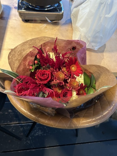 真っ赤な花束をグランピング泊まりにいって渡したら、娘は大きな素敵な花束に感動して泣いてくれました💕本当に記念に残る素敵なお花でした。