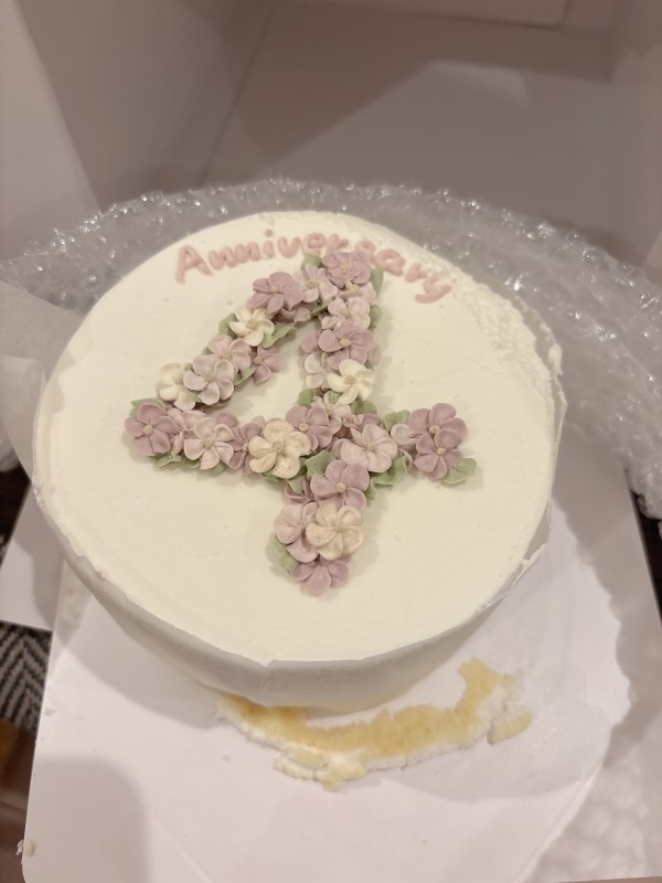 Happy Birthdayの部分をAnniversaryにしてもらうようコメントへ記載したところ、対応してくださっていたので安心しました。悲しかったのは梱包の甘さ。ケーキ台からずれ、円周がつぶれかけた状態で届きました。エアパッキンでぐるっと包んだだけなのでそうなってしまうのでしょうね。衝撃のせいか、解凍後には数字近くにひびも入ってしまいました。お店によって梱包状態がかなり異なるので、梱包材をしっかり使ってくださるケーキ屋さんへの感謝が強まりました。可愛いデザインでずっと憧れていたので今回お願いしましたが、少し残念でした。