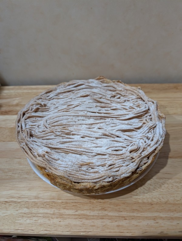 パイがパリッパリで、洋酒が香りがほんのりして栗などが入っていないシンプルなモンブラン。冷凍なのにパイのパリパリ度合いにはびっくりです。美味しかったです。