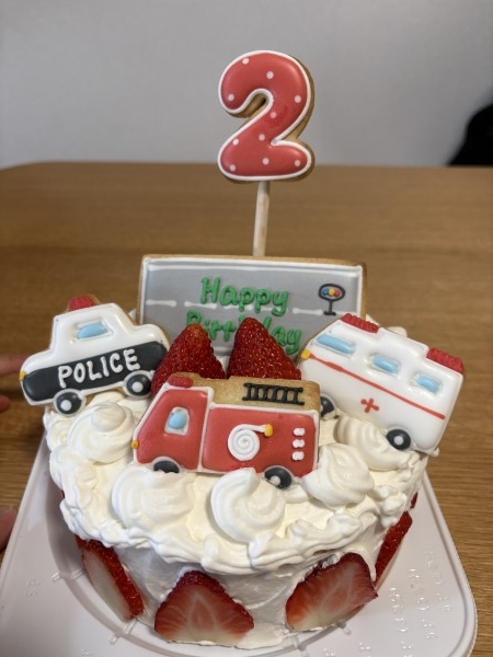 のりもの好きな息子の2歳の誕生日でケーキを手作りしました。可愛いアイシングクッキーを見つけたので今回お願いしました!