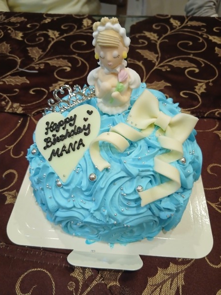 とても可愛らしいケーキにみんな声を上げて喜んでくれましたが、お人形の首が折れて真っ二つでした。仕方なくホイップクリームを絞って接着剤の代わりにしました。残念でした、