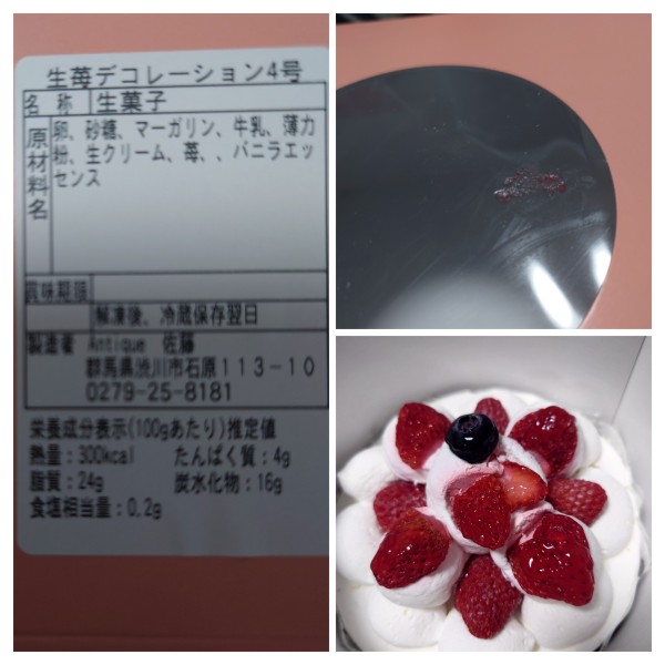 到着時に、箱の窓の部分にイチゴ(ジャムっぽい)が付いていたのが気になっていたのですが、いざ食べる時に箱から出すと生クリームがひび割れ、スポンジのカスがボロボロ出てきたりしていました。