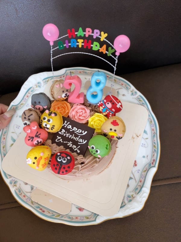 28歳の娘のお誕生日に,このケーキに致しました💝普通の苺ショートホールが普通のお誕生日のケーキなので、予想を遥かに超えて、見た目でも歓声が上げた時あがり💝その上に、娘の寅年なのでそれを食べたり、他のマカロンなら可愛い動物たちが目をひき、本当にケーキでこれだけ盛り上がるのかと思うぐらいでした✨✨味も甘すぎず大見た目と味が良いところなどは中々無いのでまたお願いしたいです✨✨感謝です。✨✨