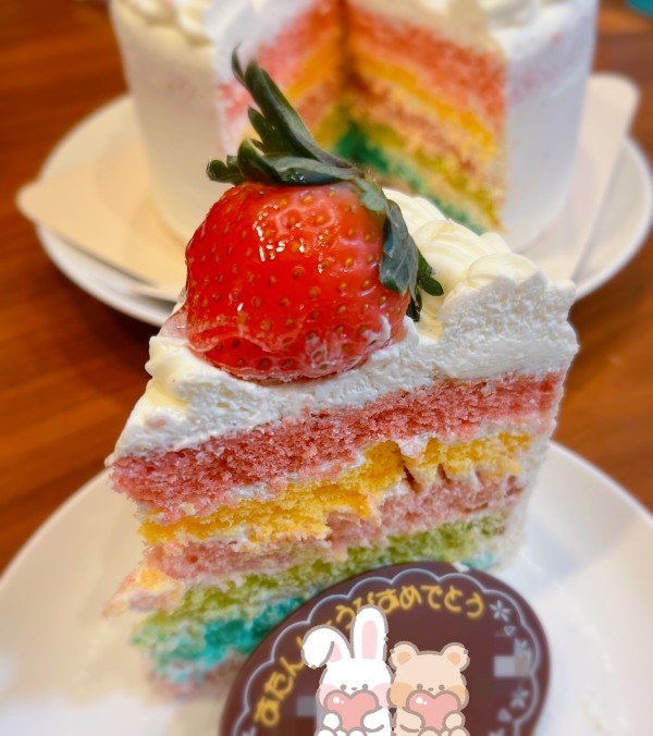 【良かった点】 •綺麗なレインボーの断面になっていた •子供が大興奮 •クリームは美味しい 【残念な点】 •イチゴがブヨブヨ •色の層ごとに味が違うので、一度に食べると口の中で味が混乱する →層ごとに食べました 映え重視で良いのですが、味は正直そこまで美味しいわけではなかったです。 記念にはなりました。