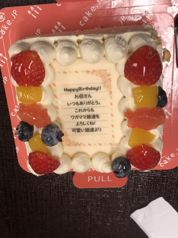 娘の誕生日お祝いでホテルで利用させていただきました。娘はとっても喜んでおりました(^^) 味もすっきり美味しいケーキでした。ロウソクもありがとうございました。 写真転写タイプのケーキにしましたが、お店のおすすめアプリで加工してアップロードしましたが、全体的に、ぼや〜とモザイク状だったので、改善できるならもう少しハッキリとした転写がよかったです。 しかしながら、手ぶらでホテルでケーキを準備するこの手軽さ、とても助かりました。