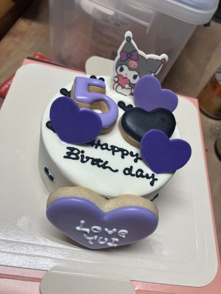 ただ、全部、文字のクッキーをピンクで注文したはずだったのに、違う色でした。私の間違いだと思うのですが……。あと、デコパーツを、ケーキに上手くさせませんでした。 -