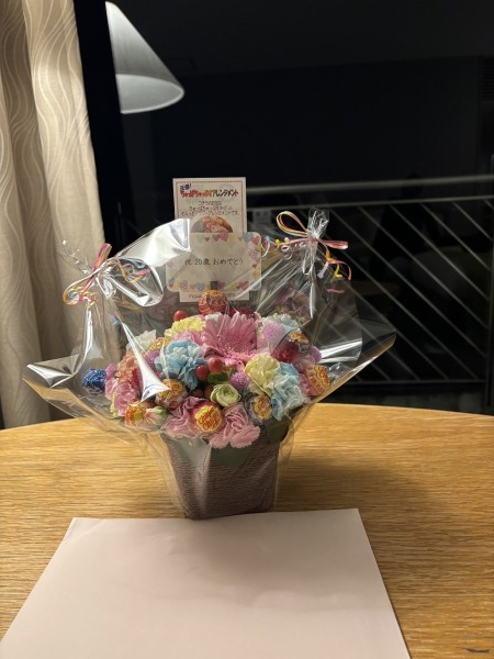 娘の二十歳のお祝い旅行の旅館へ 届けて頂き サプライズで部屋へ届けて頂きました カラフルで素敵な商品でした!