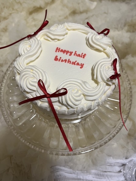 味は普通のショートケーキと同じ味で、中にイチゴとクリームが入っています。 見た目は少し文字が真ん中よりも横に寄ってしまっていると感じたけど、それ以上に見た目が可愛いので満足です! リボンは袋に入っているのを自分で取り出して付ける感じです!