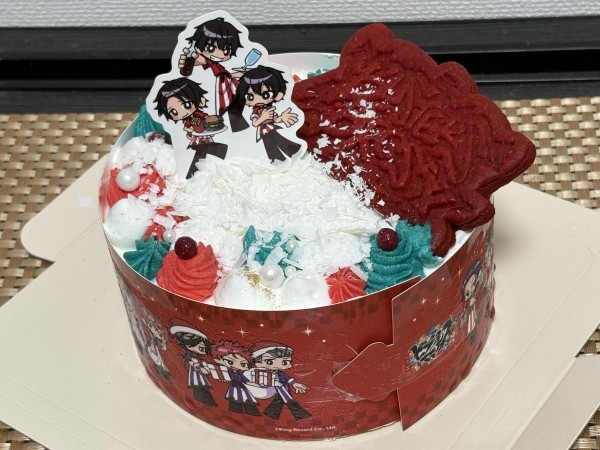 クリスマスが近く、推しているジャンルとのコラボだったため購入しました。赤と緑のクリームと散りばめられた金粉が、クリスマスを連想させてとても良かったです。付属の粉をかけると雪みたいで見るだけでもとても楽しいケーキでした。美味しかったです。 この度はありがとうございました。