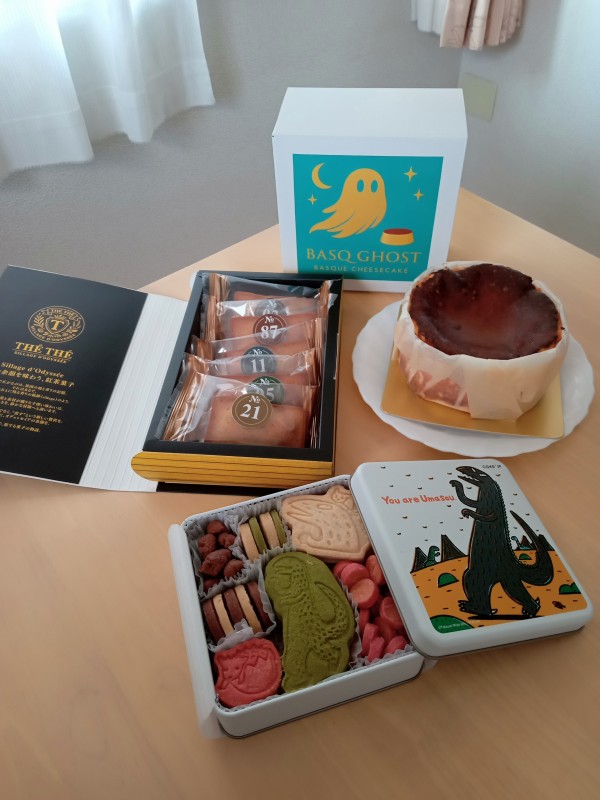 バスクチーズケーキ、お茶系の味のフィナンシェ5個セット、『おまえうまそうだな』のクッキー缶が入っていました。まだ食べていないのですが、クッキーはねないこだれだ缶を食べたことがあるので、美味しいに決まってるし、チーズケーキとフィナンシェも美味しそうだし、なんといってもすごいお得!また利用したいと思います。