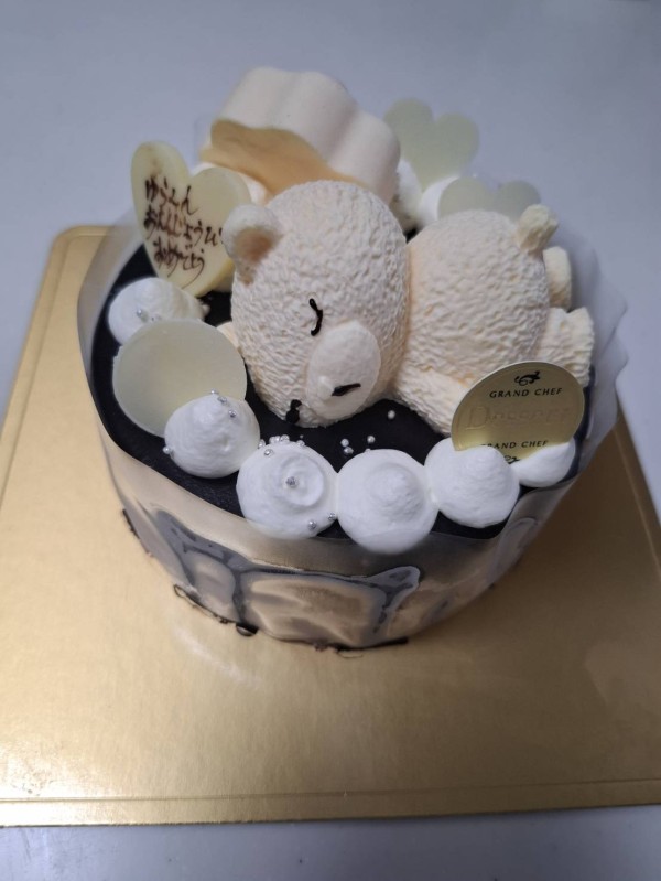 可愛くて、味は濃厚で美味しかったです。トップの前面にサンタさんマカロン?がくまちゃんの顔に被ってしまっており、解凍した時に赤い染料がくまちゃんの顔に付いていたのが少し残念でしたが、子ども達はさほど気にせず喜んでくれました。